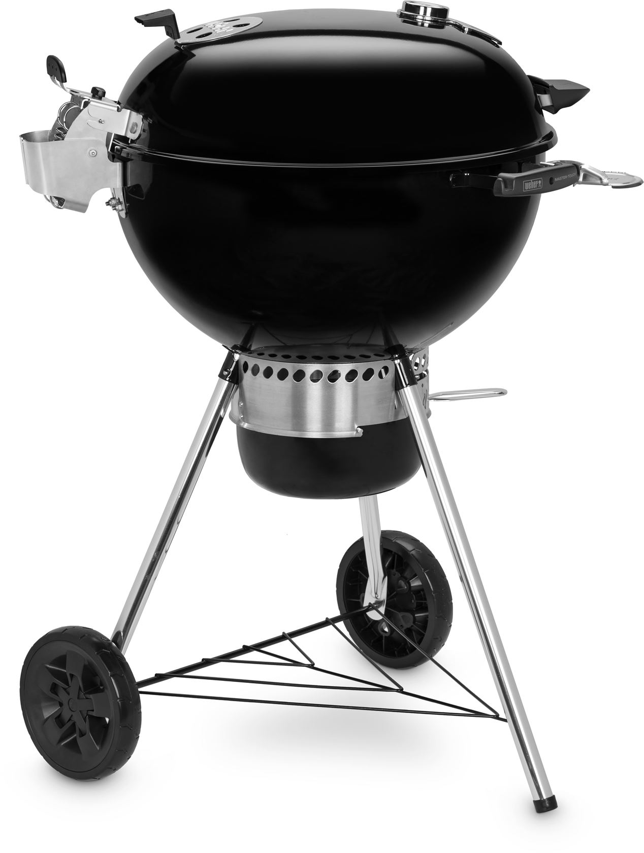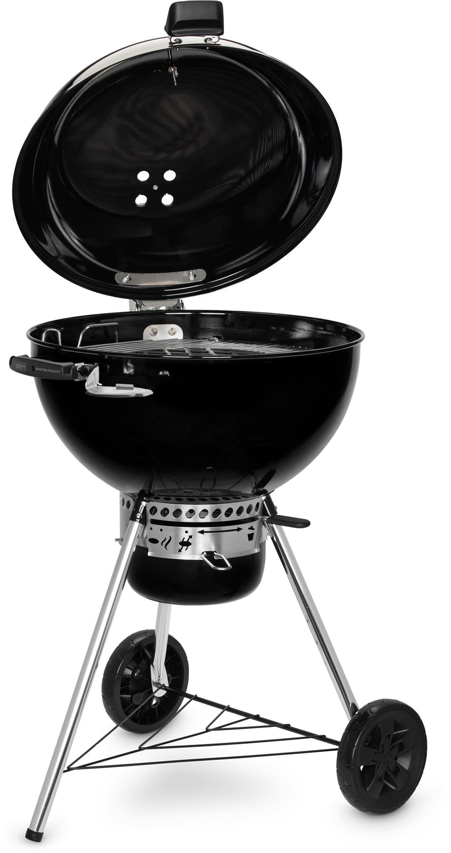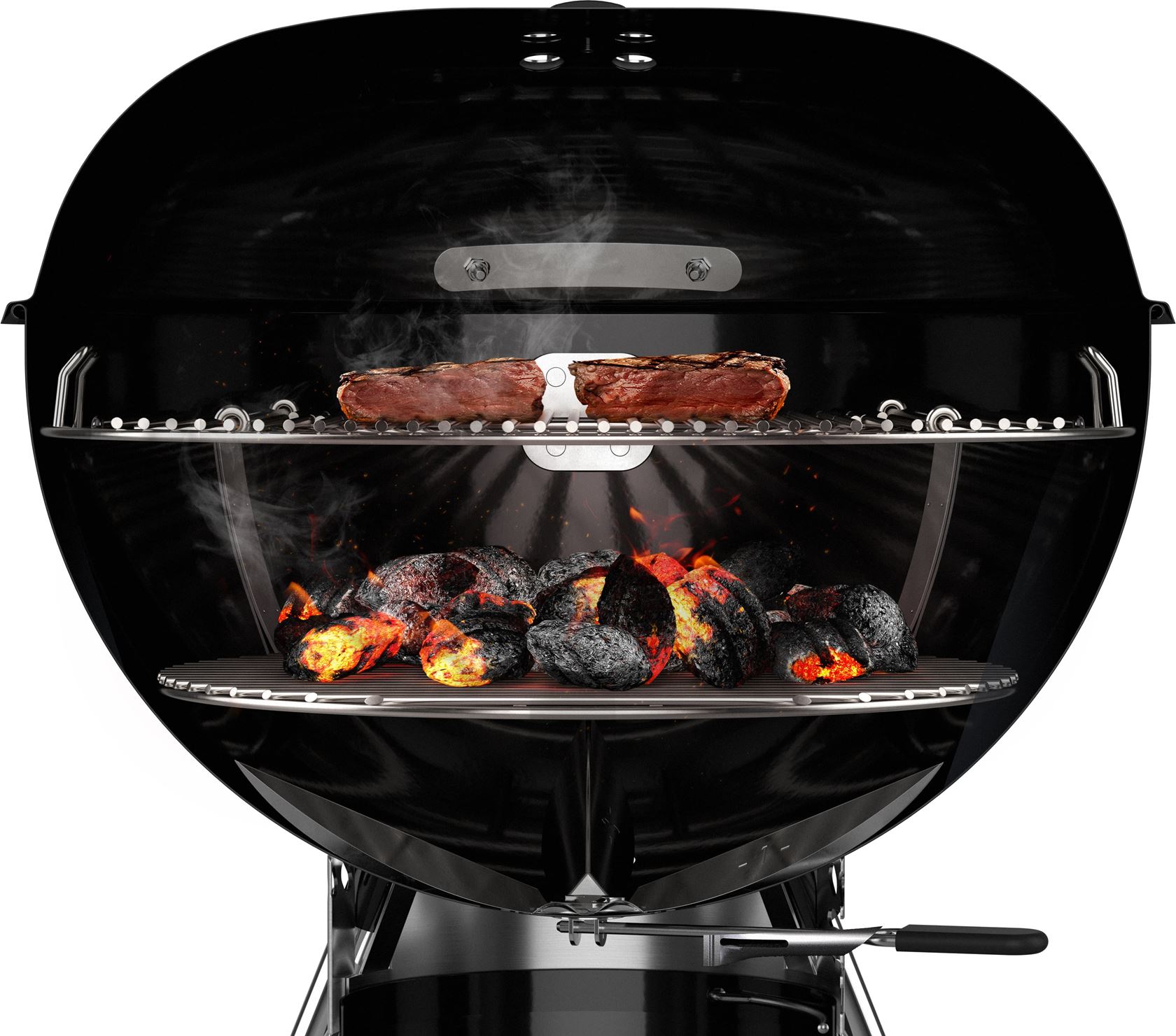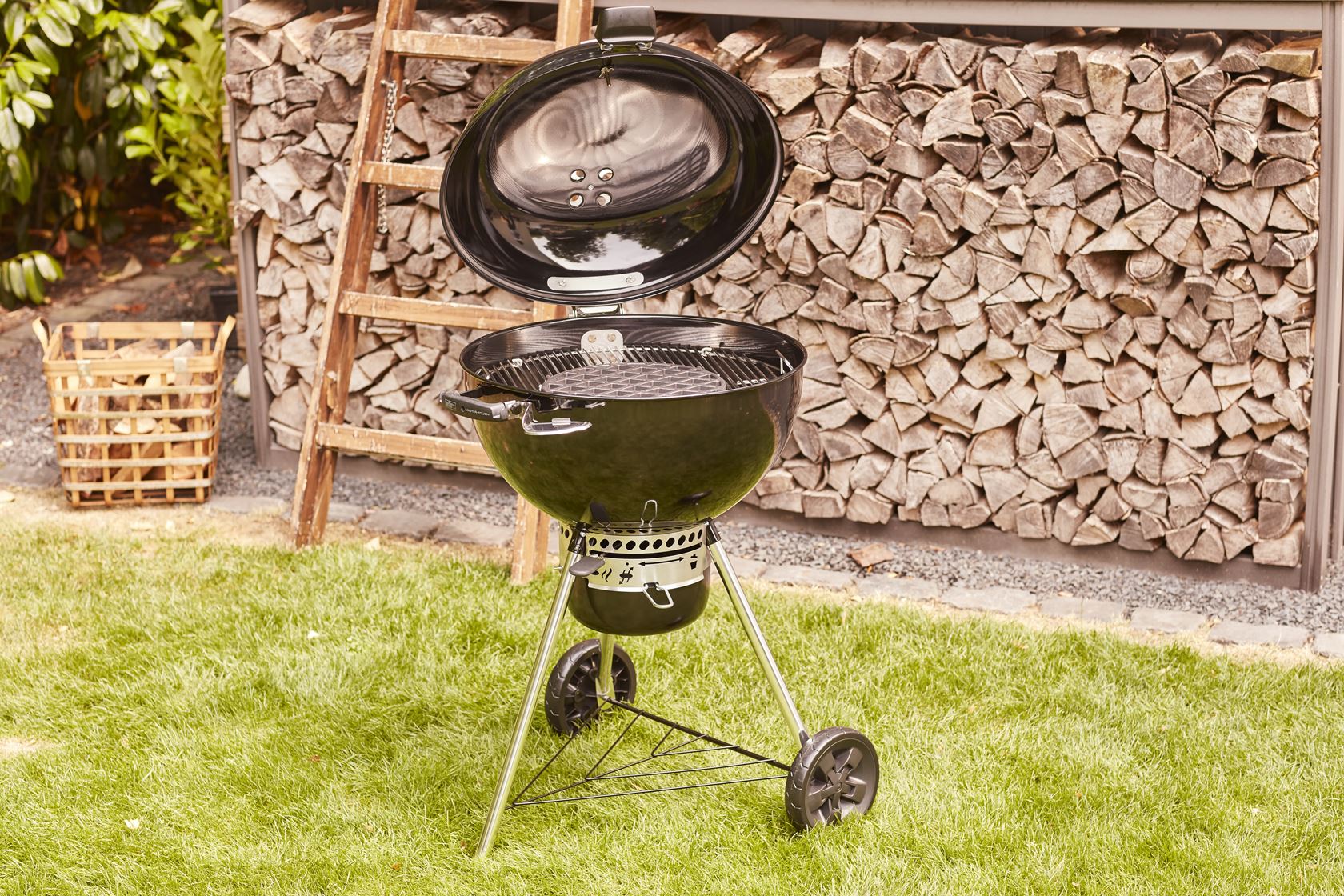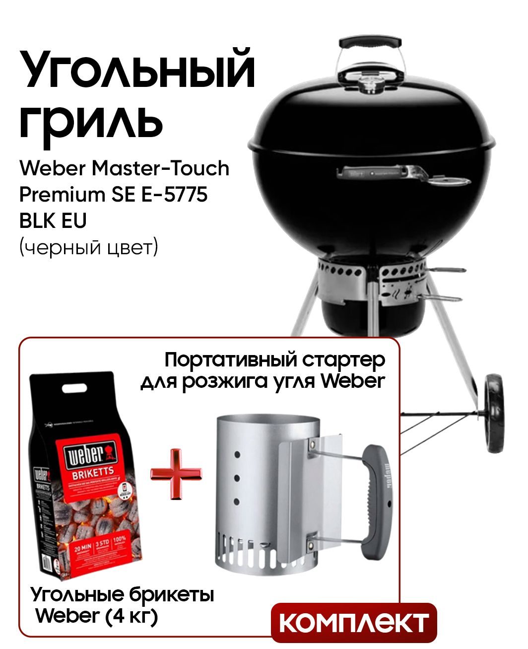 В основе комплекта — сферический угольный гриль Weber Master-Touch Premium E-5775, премиальная модель с увеличенной решёткой диаметром 57 см, рассчитанная на большую компанию. Гриль удобно разместить на веранде, террасе, балконе или в саду. Котёл и крышка выполнены из прочной стали с фарфоровой эмалью, что обеспечивает долговечность и отличное удержание тепла.